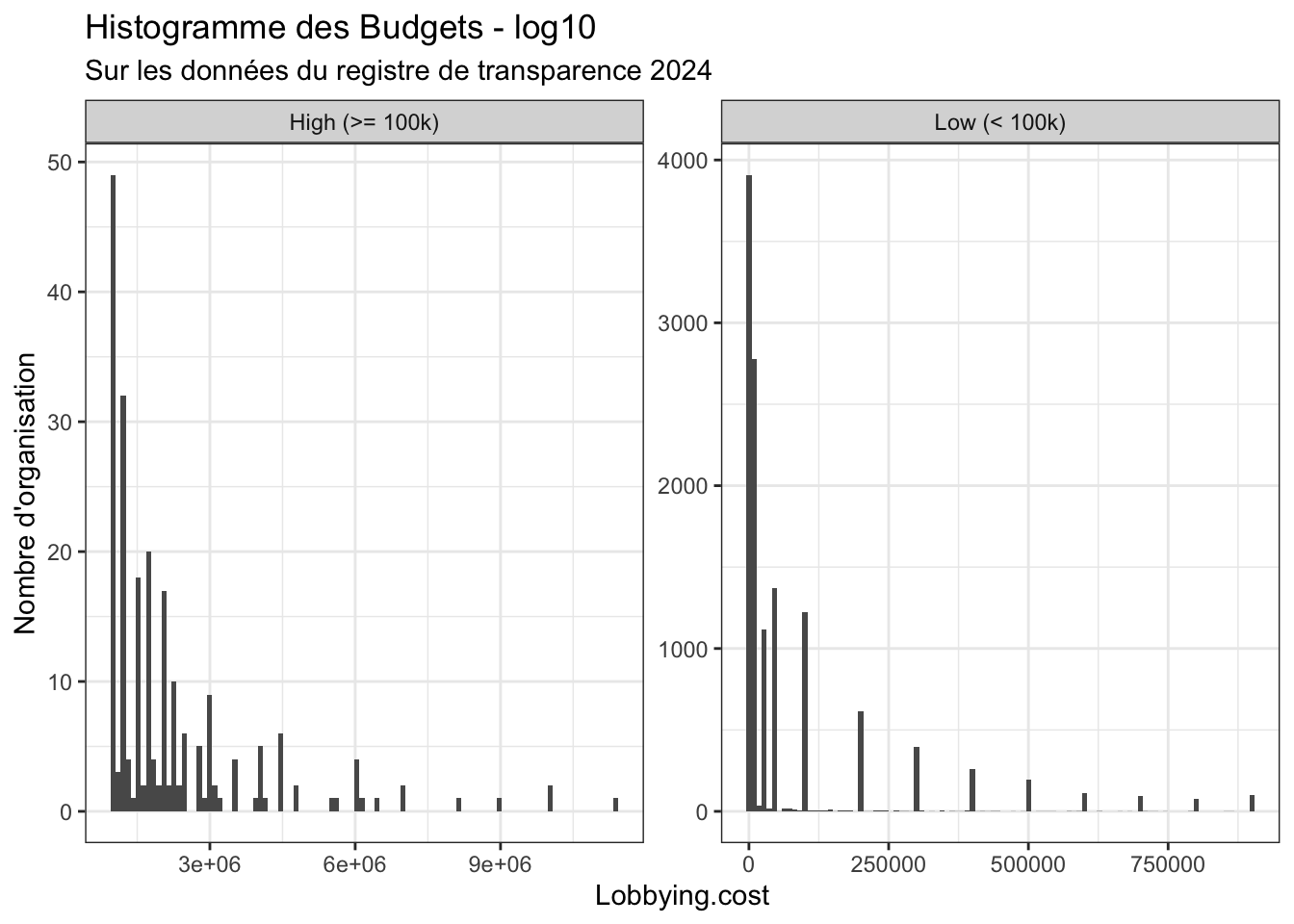 On utilise aussi en parallèle les données nettoyées par LobbyFacts, qui permet de nettoyer des informations sur le nombre de temps pleins et sur les budgets : https://www.lobbyfacts.eu/