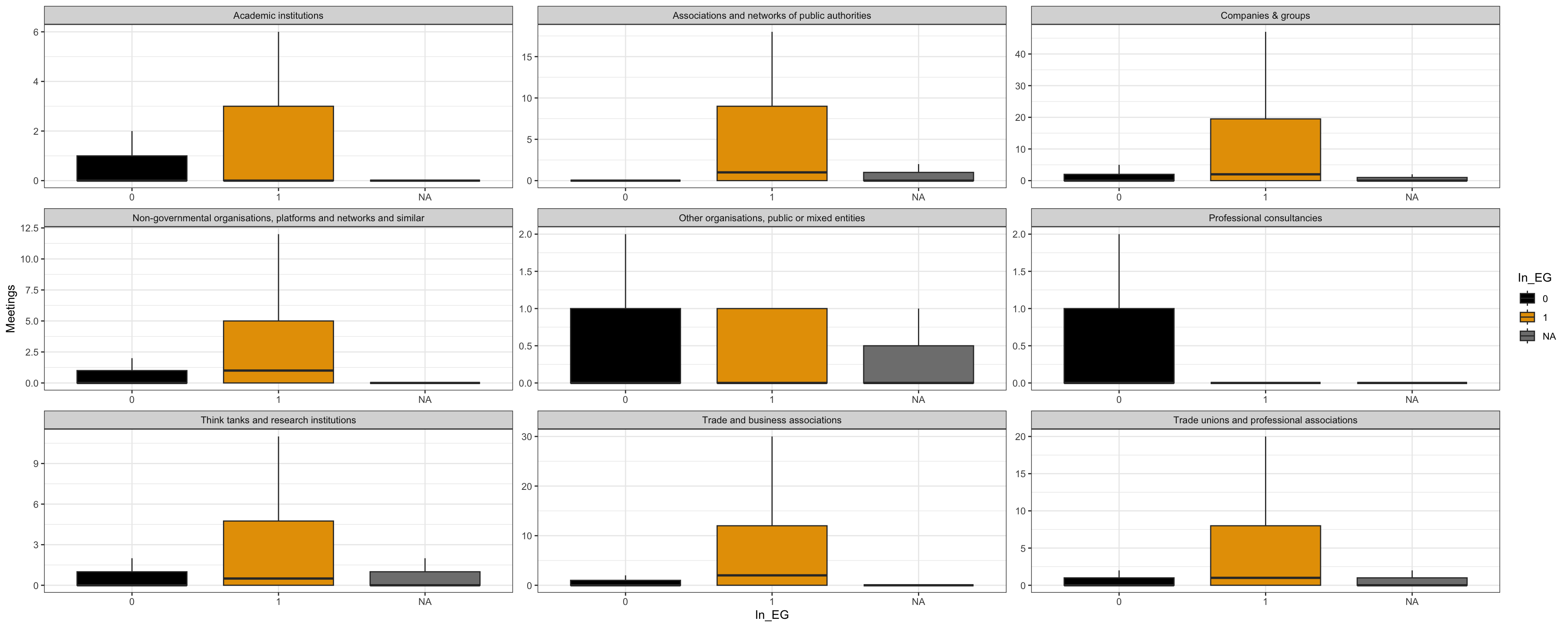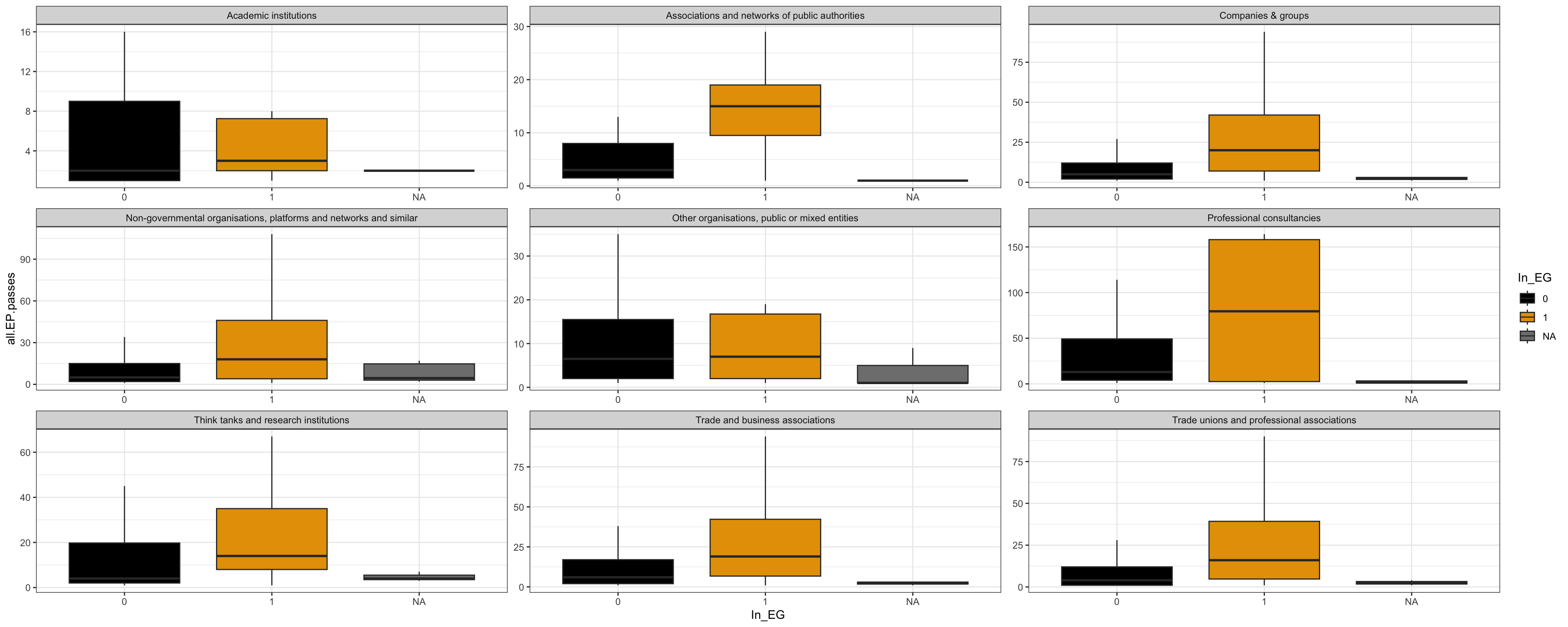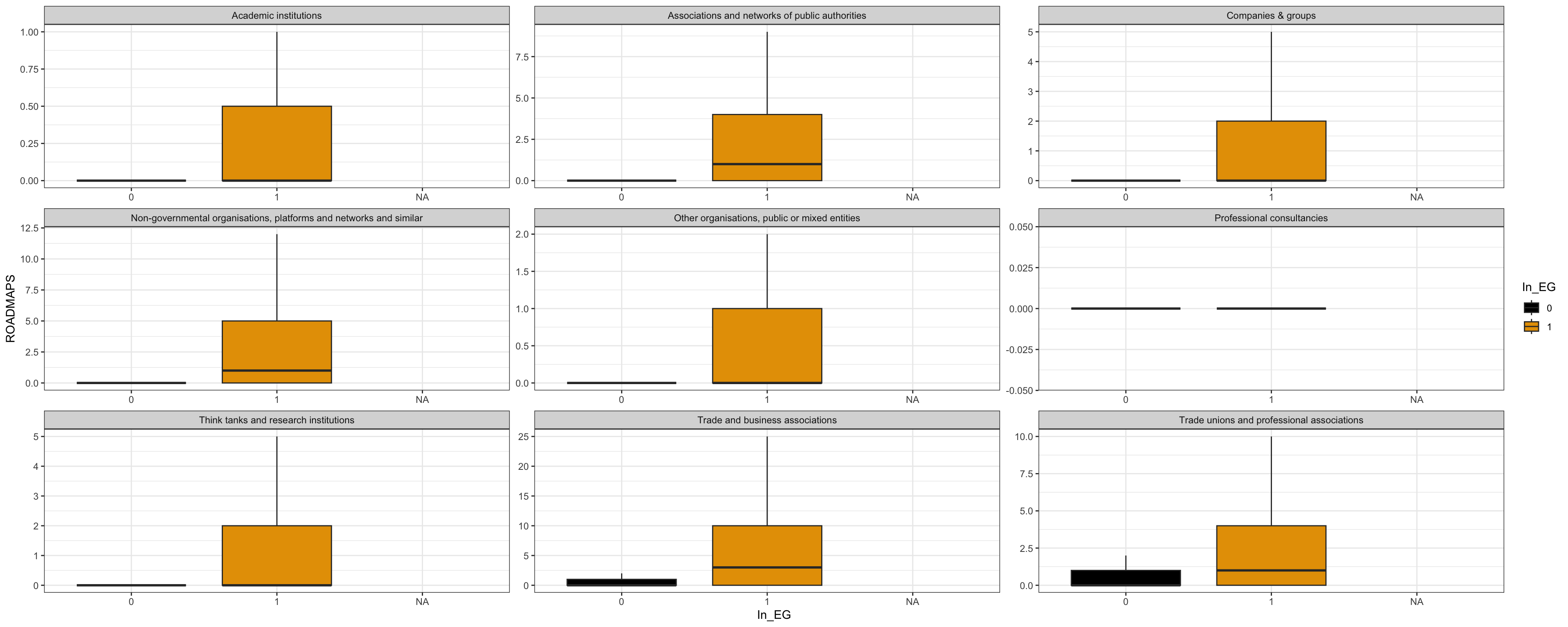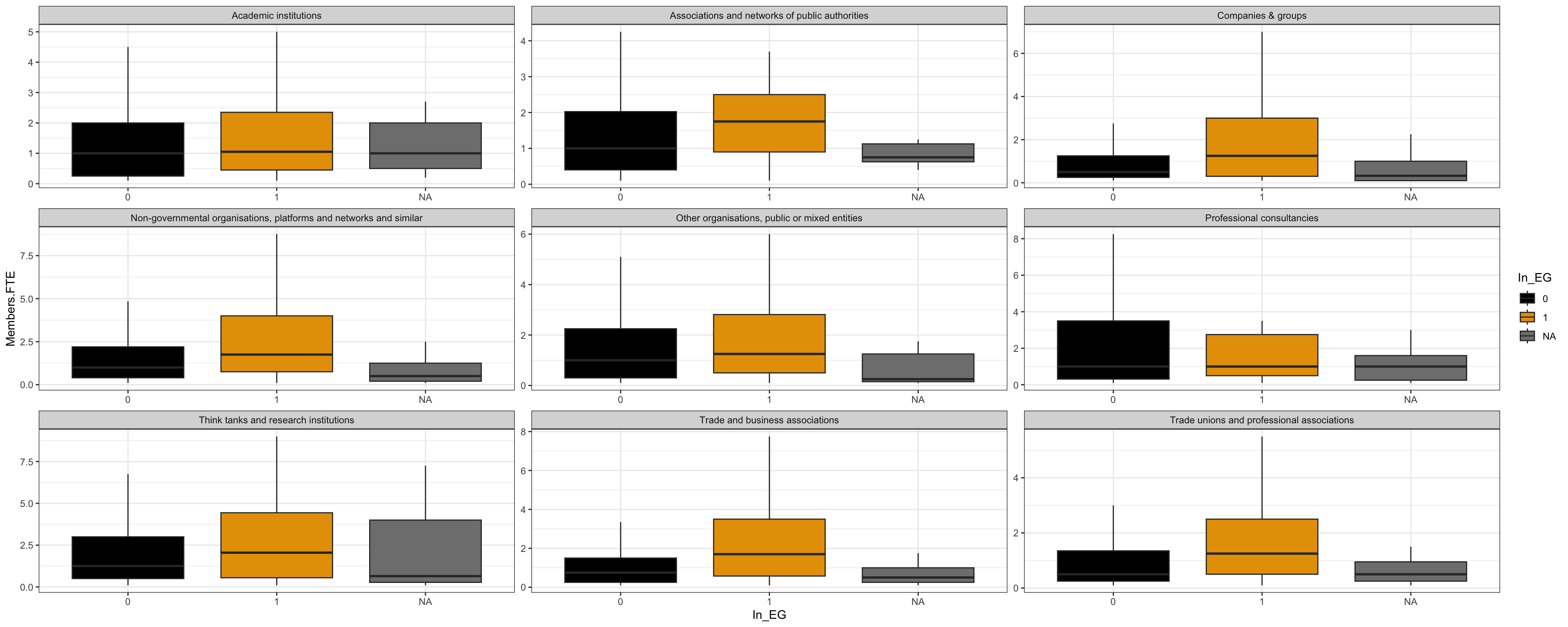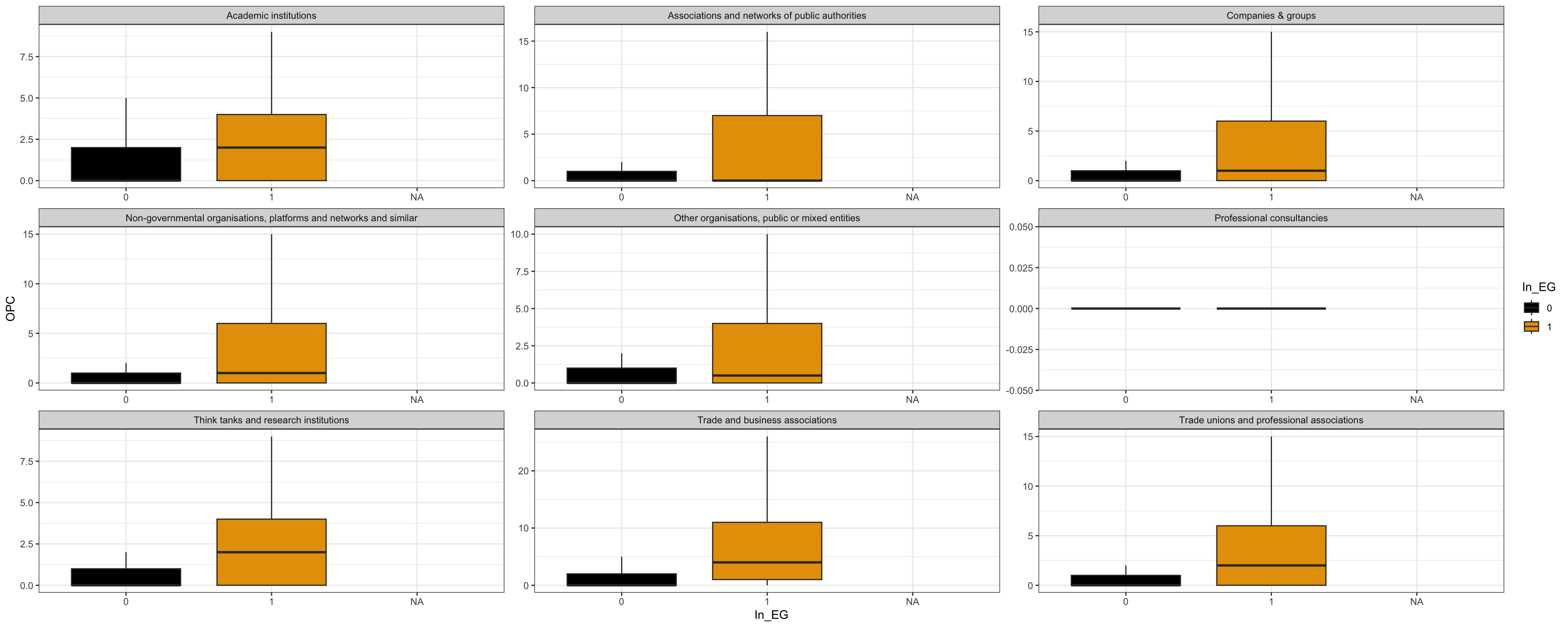 | Non-governmental organisations, platforms and networks and similar | 1 (0 - 6) | 13 - 91 / 549 | 0.00 (0.00 - 1.00) | 3.00 - 41.00 / 2,862 | ||
