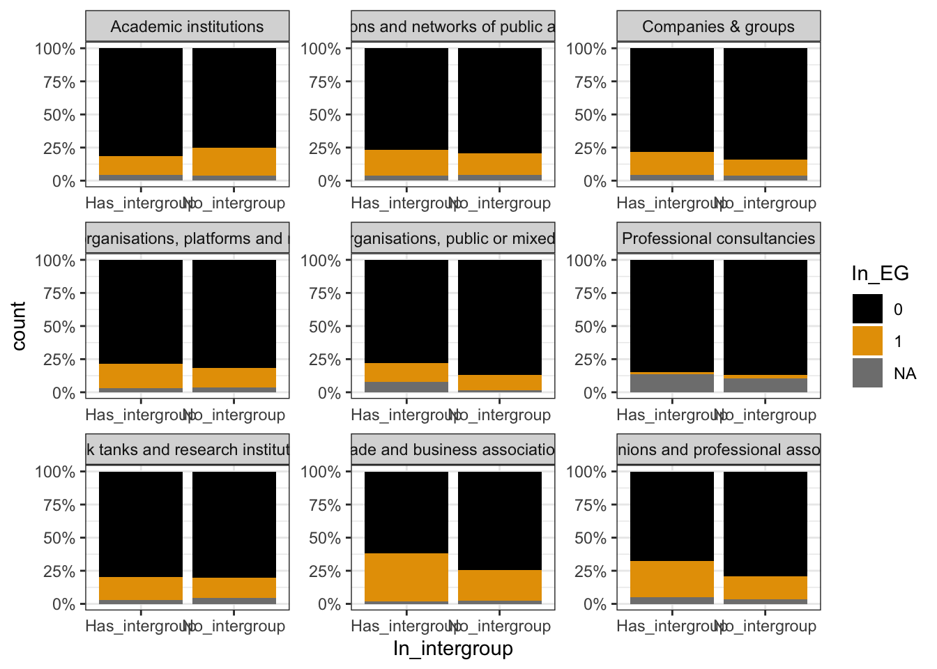 | Trade and business associations | 431 (34%) | 232 (28%) | 715 (17%) | 1,159 (20%) | ||